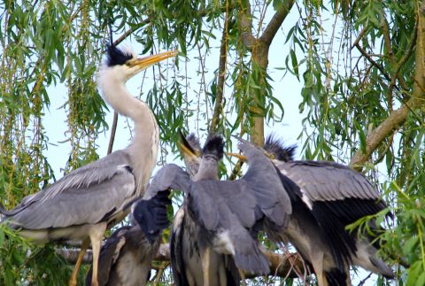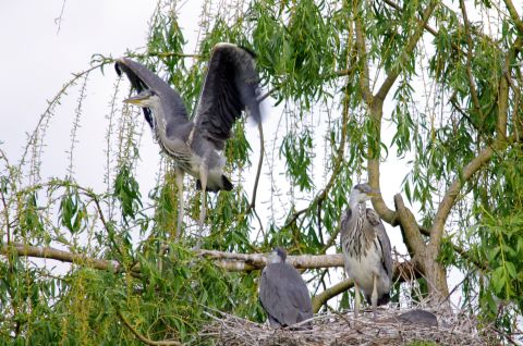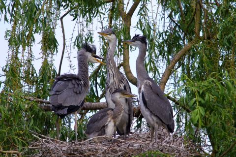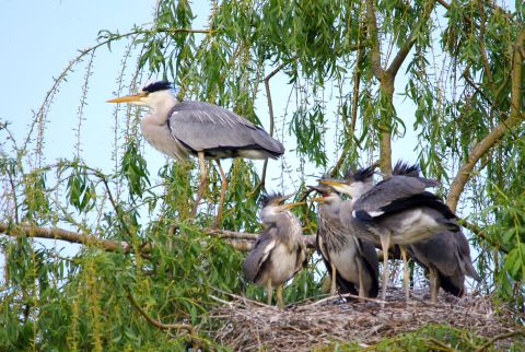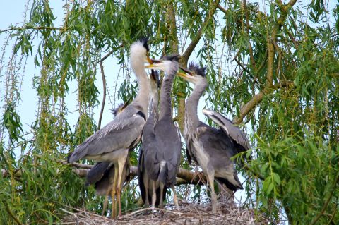 Die knapp 1m großen Graureiher bauen ihre Nester in der Regel weit oben in Bäumen und brüten in Kolonien. Die