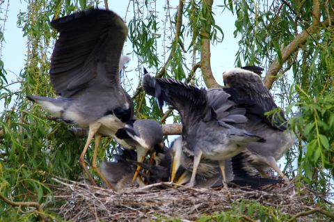 Graureihernest: Fütterung der Jungen